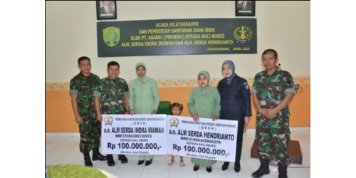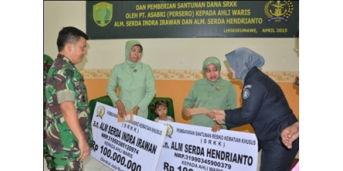 Jumat 10 April 2015 Kakancab PT. ASABRI Banda Aceh Suharti, S.E melakukan penyerahan Santunan Resiko Kematian Khusus (SRKK) kepada ahli warisnya. Penyerahan dilakukan di Kodim 0103/Aut didampingi oleh Danrem 011/LW Kolonel Daniel Chardin dan Ka Kcp PT ASABRI Lhokseumawe Makhruzar, BA.