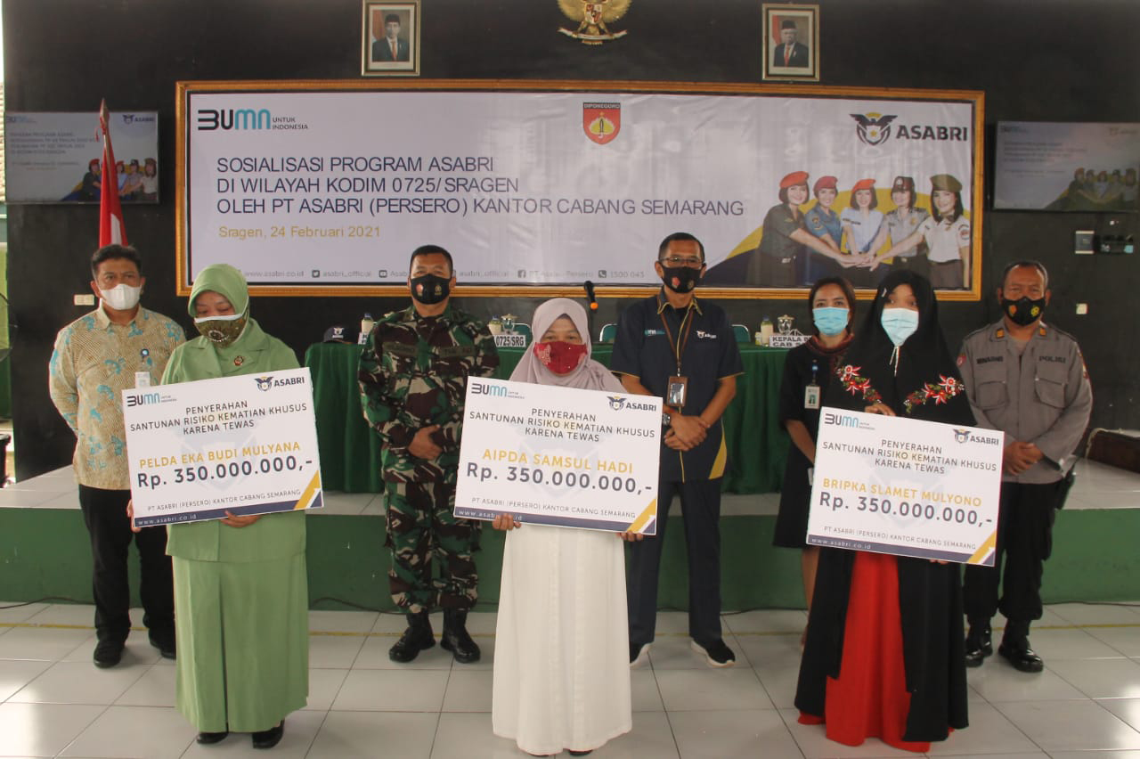 Penyerahan manfaat asuransi Asabri SRKK-Tewas diberikan secara serentak kepada ketiga istri ahli waris di Aula Makodim 0725/Sragen. Sesuai amanat PP 54 Tahun 2020 PT ASABRI (Persero) KC Semarang menyerahkan manfaat SRKK Tewas sebesar Rp.350.000.000,- ( Tiga Ratus Lima Puluh Juta Rupiah) kepada masing-masing ahli waris.